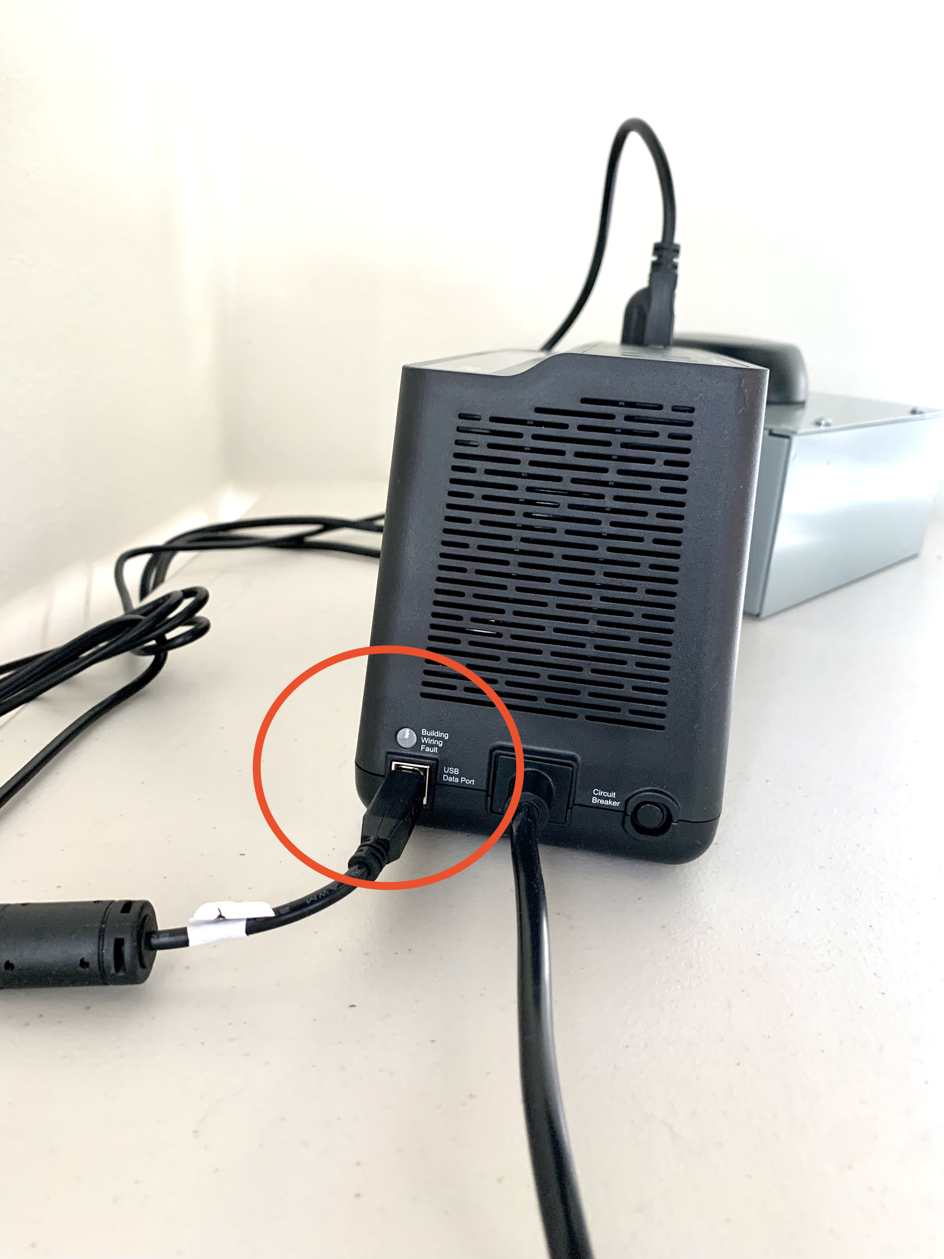 Next, confirm that the USB Data cable extending from the Hearo Hub box is plugged into the battery backup.
