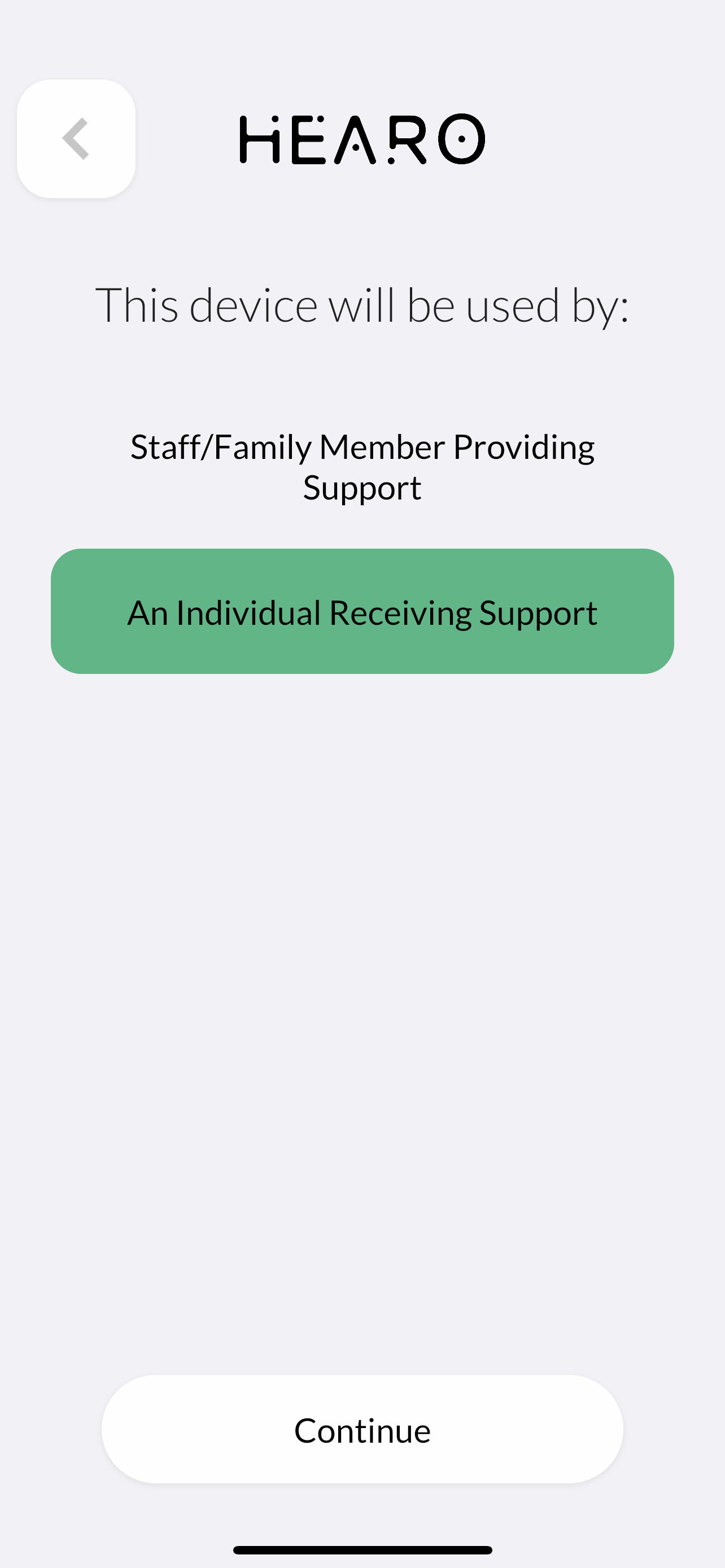 Logging in to the Hearo Mobile App for an Individual Here we detail the brief process of signing in as an Individual 1. Install the correct version of the app from the links below. 2. Log in to the app using your staff or family credentials and press the Sign In button. 3. Select "An Individual Receiving Support" and press continue. 4. Select the Individual for whom you are logging in from the list that appears.