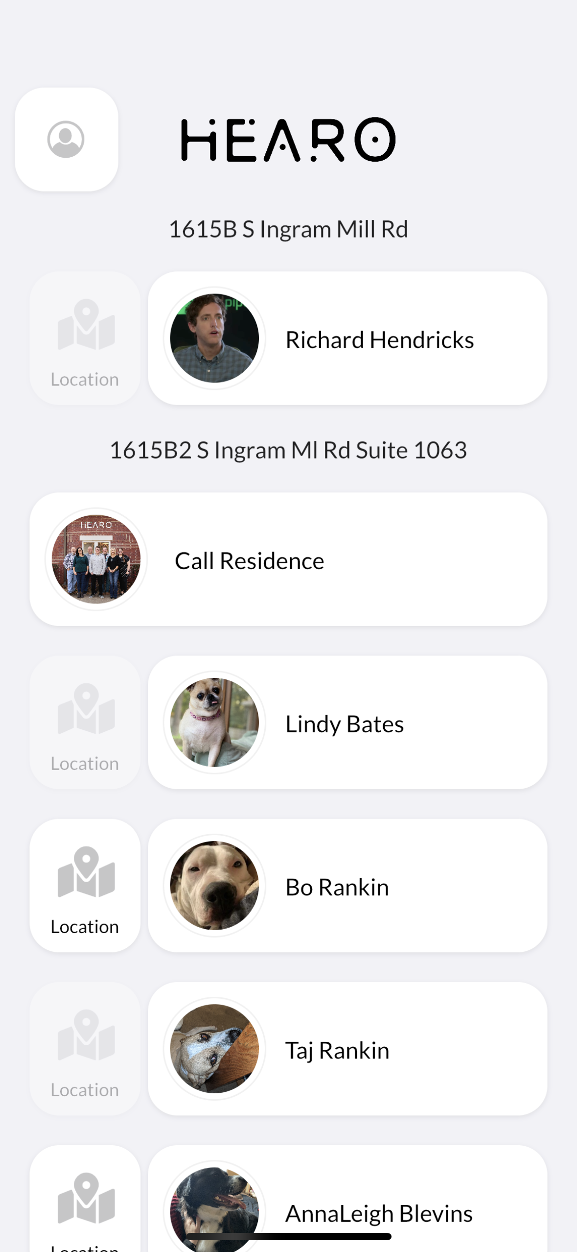 4. At this point you will see a list of Locations and Individuals that you have access to. To place a call to their device, simply tap on their name/Location. Also note, if they are using a personal mobile device and have location services turned on, you will see a "Location" button next to their name. Tapping on this will display the latest GPS location captured from their device.