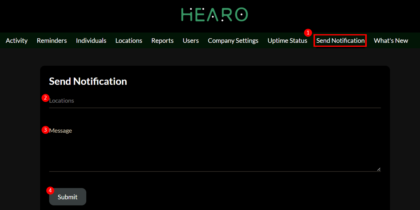 1) Select Send Notification from the Dashboard Menu.