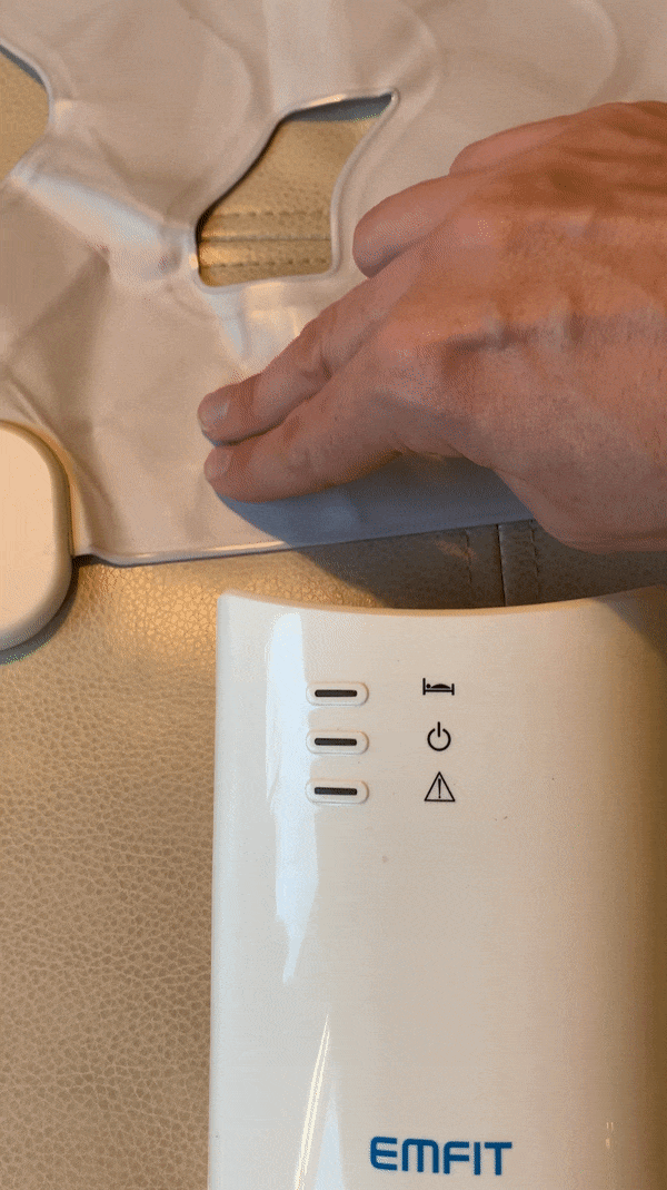 To test the mat, you'll need to perform a repeated action on the mat for around 15 seconds. The easiest way to do this is to gently and repeatedly press on the mat, as seen in the gif above. Make sure you have the control unit near you so you can monitor if your motion is being detected.