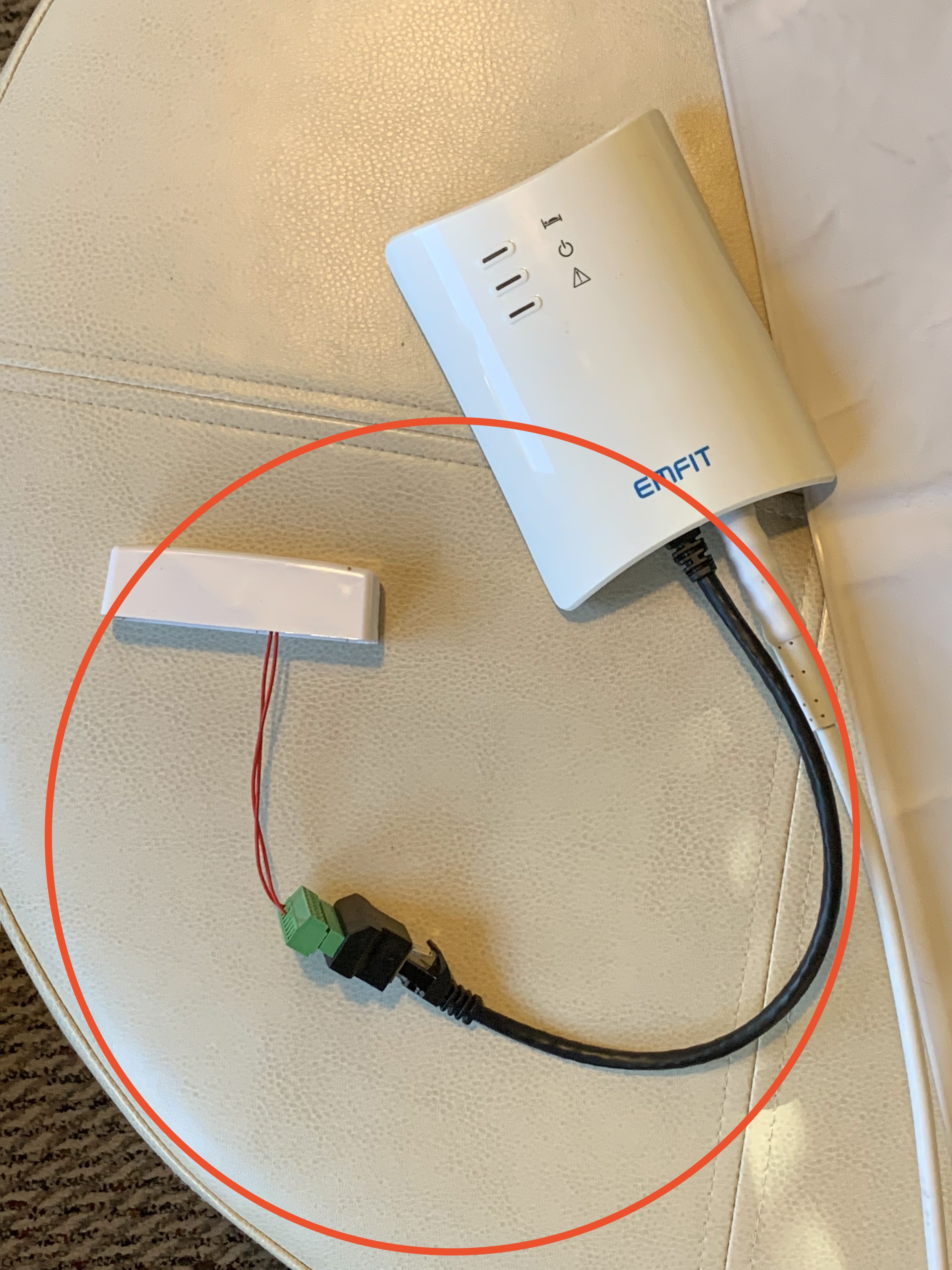 The black cable should be securely connected to the control unit. The other end of this black cable is connected to a small adapter (the black and green device in this photo above). Confirm the connection to the adapter is secure. And finally, the wires coming from the Hearo sensor and the adapter (the red wires in this photo above) can be checked to ensure their connection as well. Very gently tug the wires at each end to confirm they are securely connected.